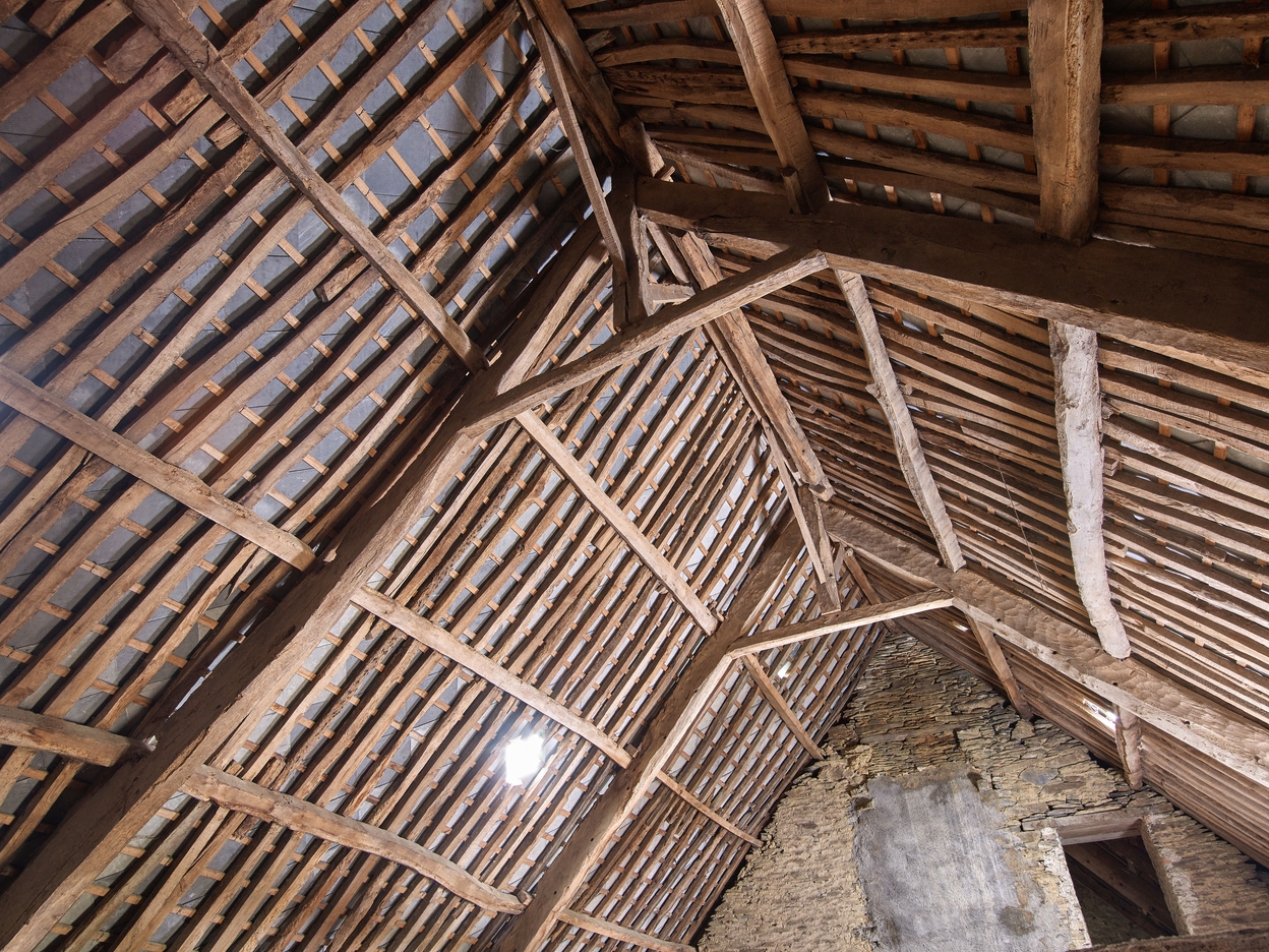Logis 17e siècle. Haut comble à surcroît à usage de grenier. Vue générale de la charpente. Fermes à entrait retroussé, poinçon court et liens de contreventementImmatriculation