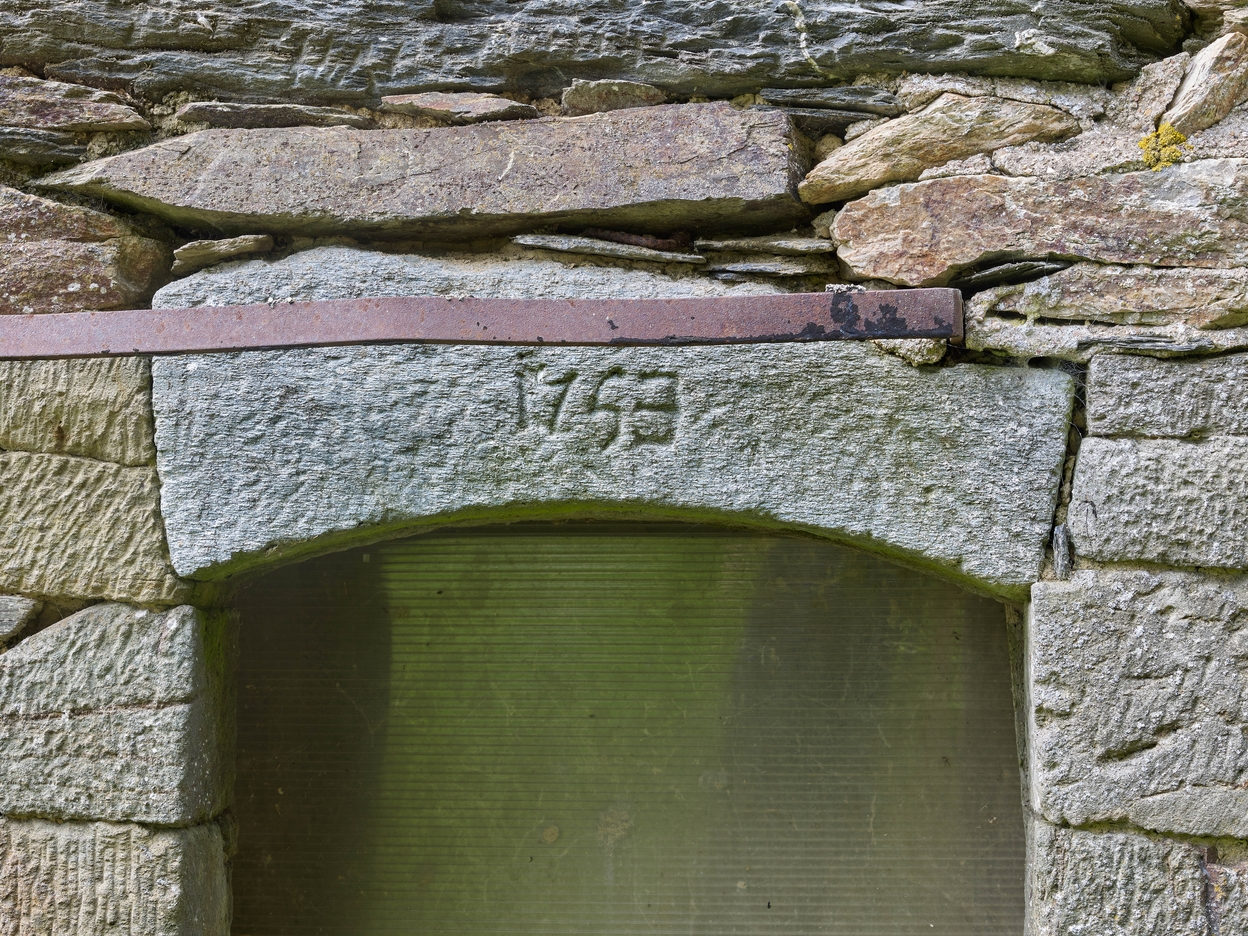 Logis-étable 1753. Fenêtre de la salle. Détail du linteau daté 1753Immatriculation