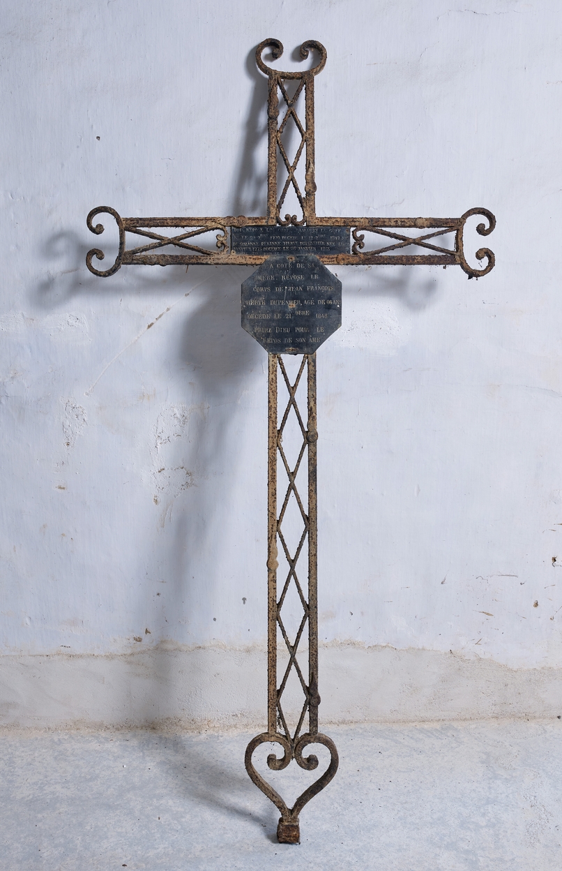 Croix de cimetière d'Amaury Le Goff décédé en 1847, de Suzanne Perinne Hervé Dupenher décédée en 1853 et de Jean-François Hervé Dupenher décédé en 1848. Croix en fer forgé, plaques de zinc rectangulaire et octogonale fixées au centre, portant des inscriptions poinçonnéesImmatriculation