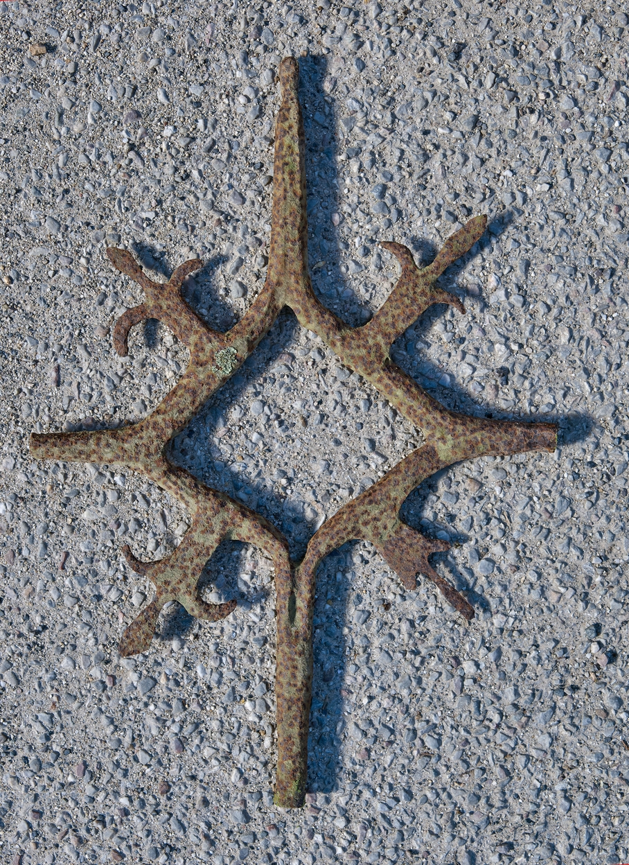 Portail d'entrée. Grille de la baie haute, en fer forgé avec motifs de fleurs de lysImmatriculation