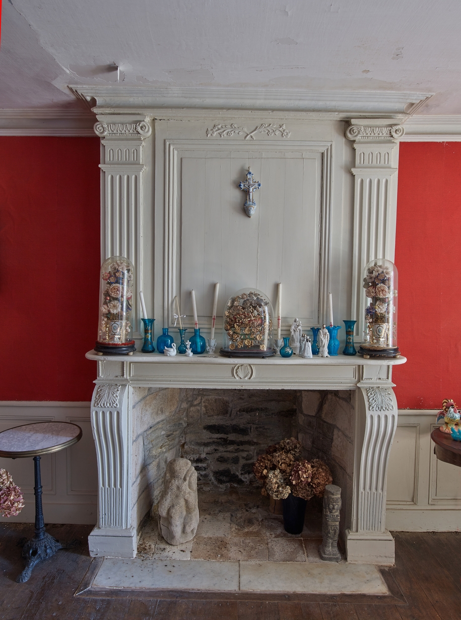 Logis. Salon. Cheminée boisée à piédroits galbés et hotte droite ornée de pilastres à chapiteau ioniqueImmatriculation
