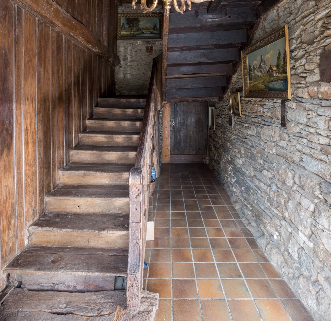 Logis 1774. Vestibule d'entrée avec l'escalier établi entre le pignon et une cloison en menuiserie. Vue généraleImmatriculation