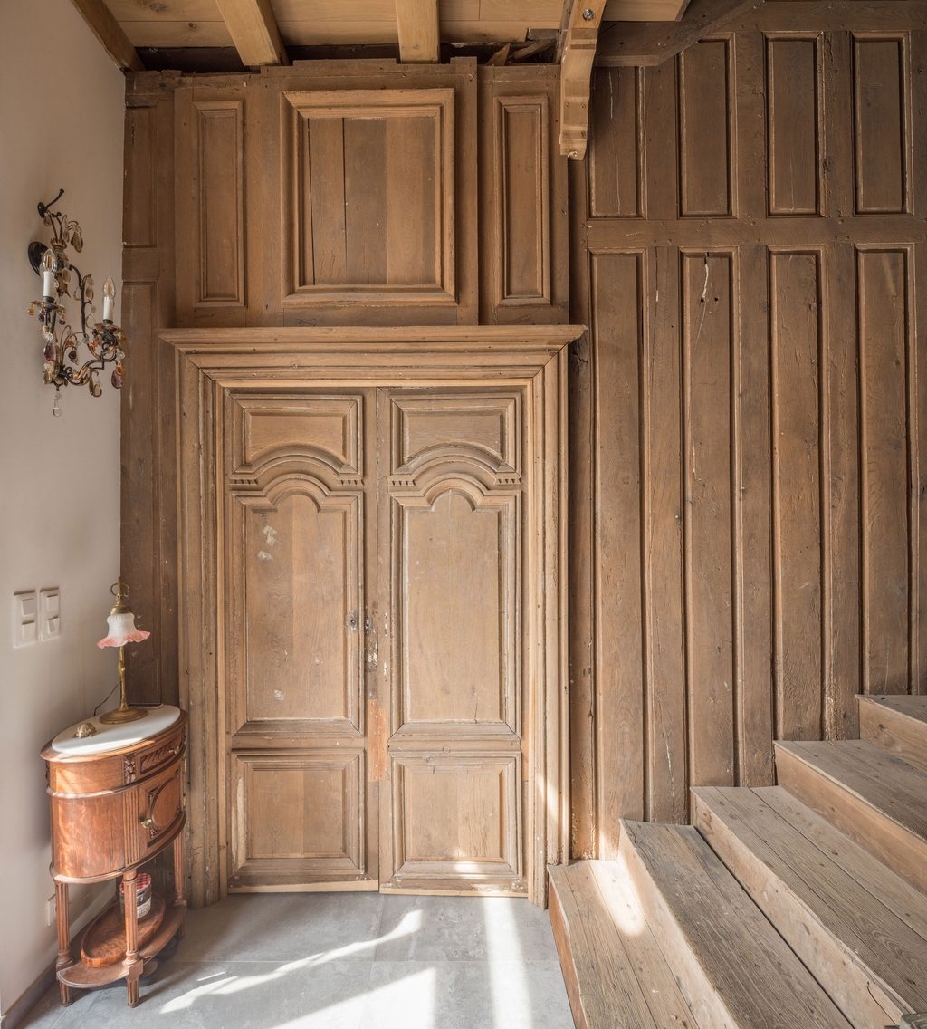 Logis, vestibule d'entrée, cloison en menuiserie et porte de la salle à manger à double battantsImmatriculation