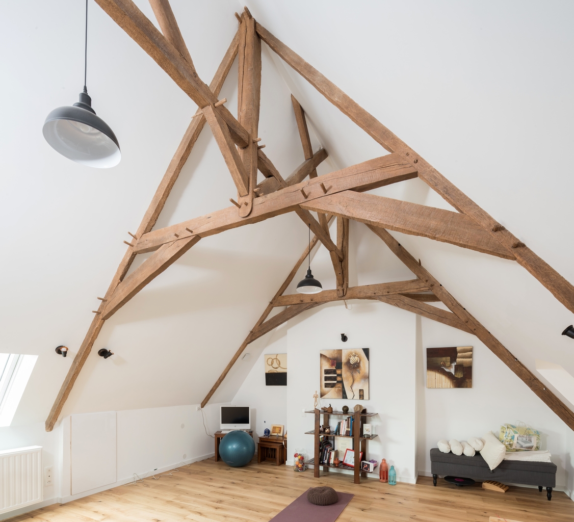 Logis, combles, vue générale de la charpente à double faîtageImmatriculation