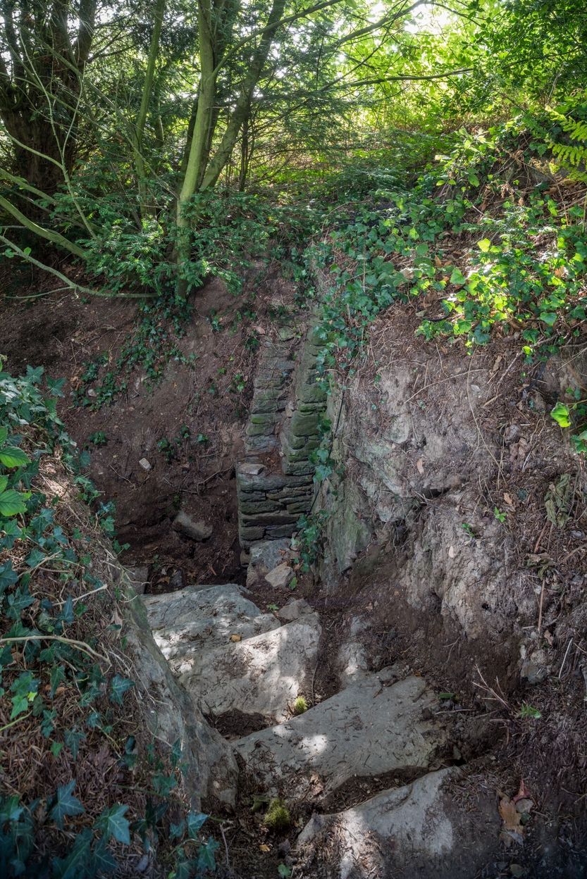 Ferme-Blanchisserie. Fontaine du lavoir. Vue en contre-plongée avec l'escalier d'accèsImmatriculation