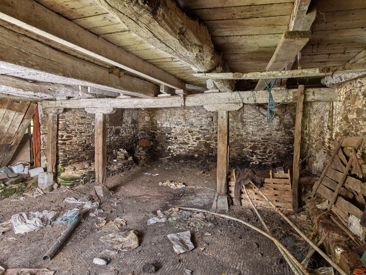 Logis début 17e siècle. Partie dévolue au conditionnement des toiles avec appentis postérieur. Système de poutraison faisant office de mur porteurImmatriculation