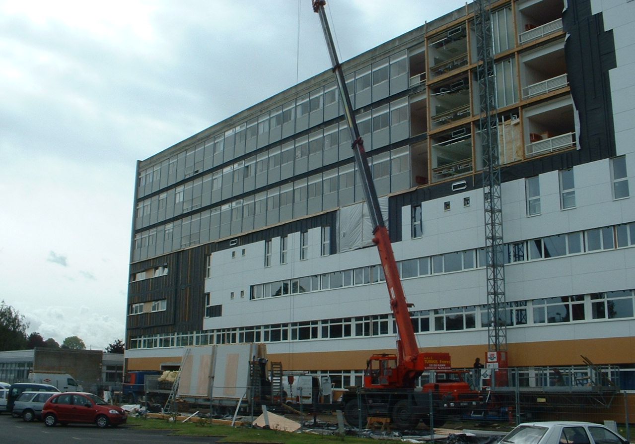 Façade est de l'internat en cour de restructuration. On aperçoit la structure après dépose des éléments de la façade rideau d'origine.Immatriculation