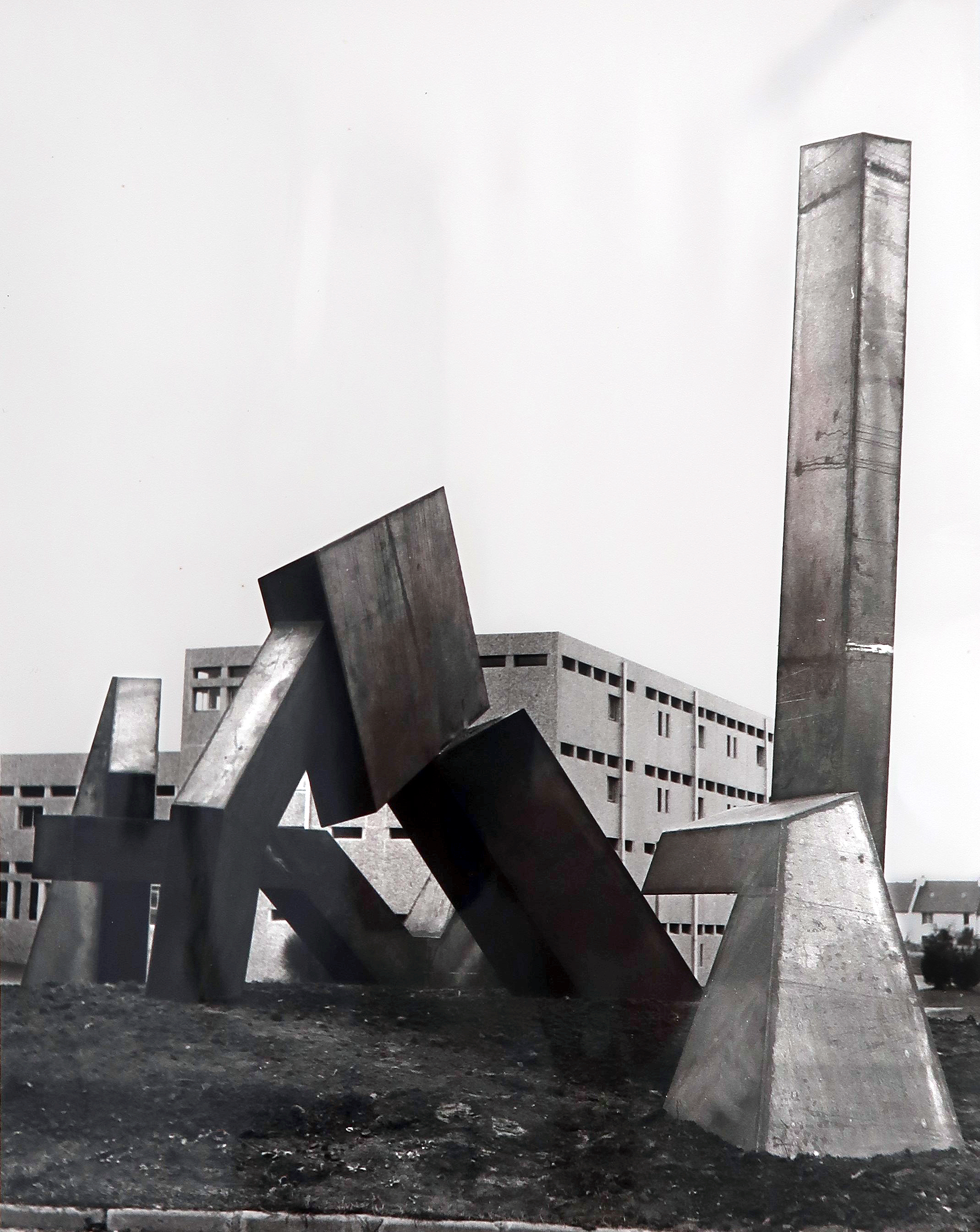La sculpture peu après sa mise en place, lors des travaux paysagers. Pierre Tual, sculpteur, vers 1975-1976. L'acier Corten, brillant, n'a pas encore pris sa teinte tabac brun.Immatriculation