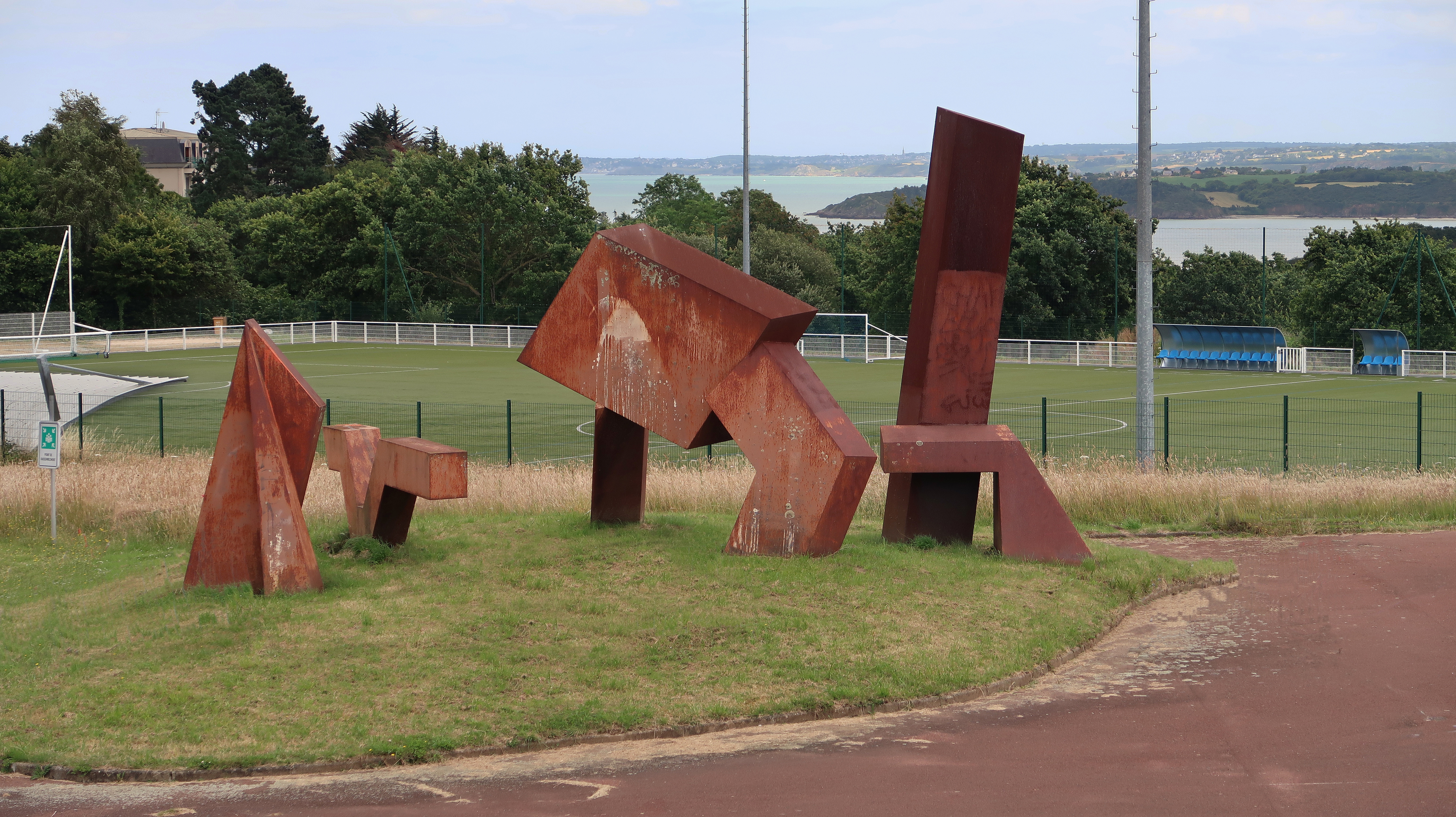 Vue d'ensemble et de situation, prise de l'ouest, de la sculpture de Pierre Tual, vers 1975-1976.Immatriculation