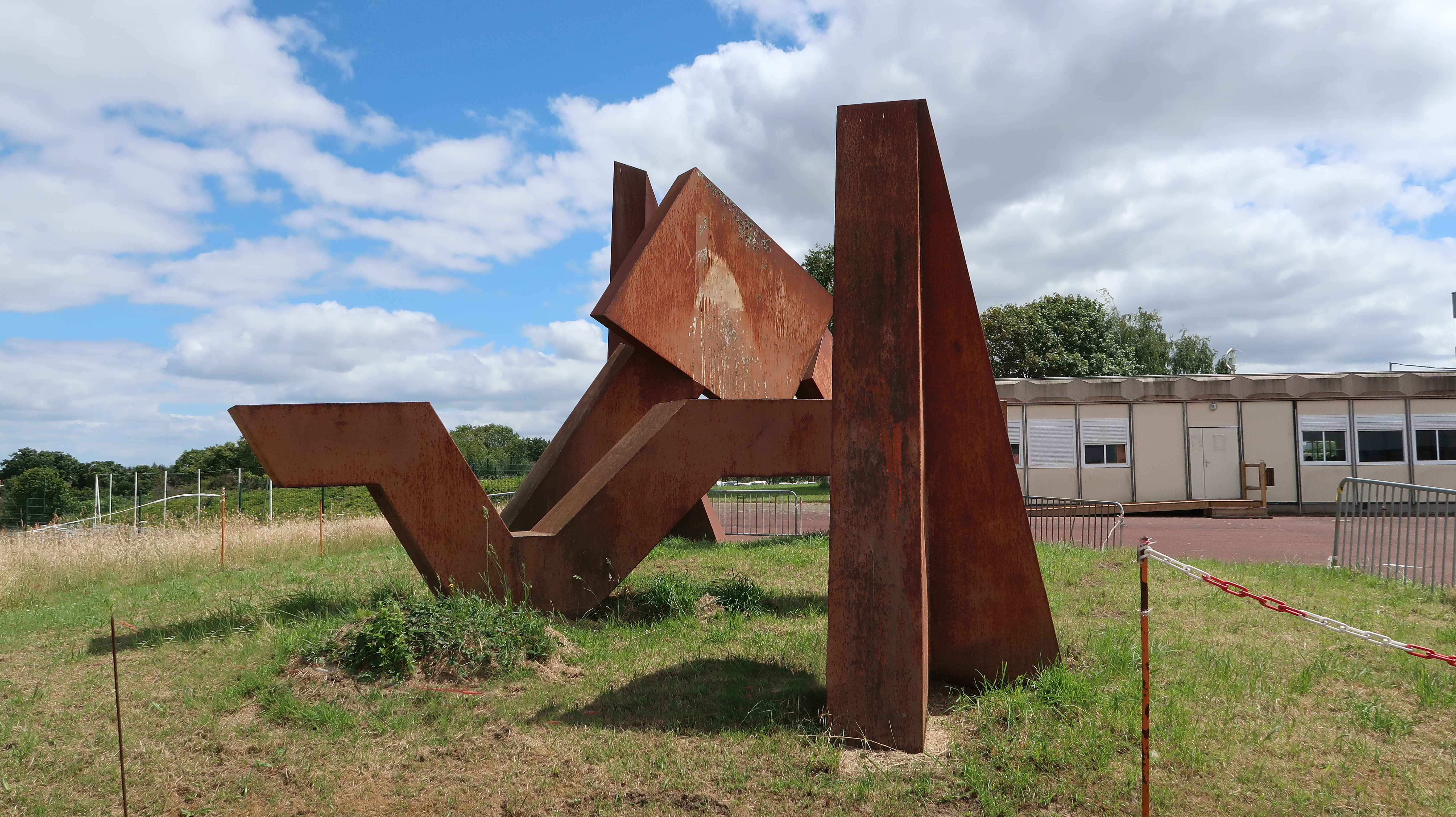 Vue d'ensemble prise du nord-ouest de la sculpture de Pierre Tual, vers 1975-1976.Immatriculation