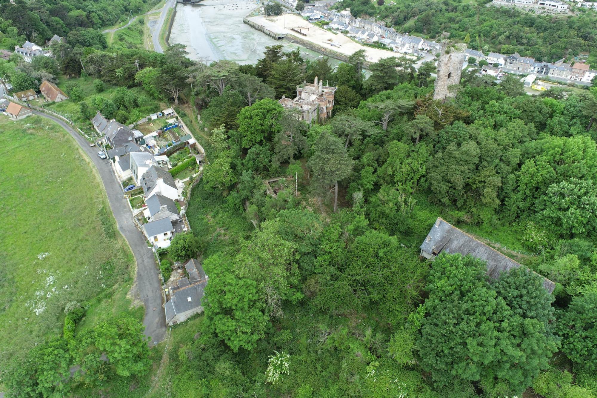 Vue aérienne oblique de la Pointe de Cesson : tour, demeure, grange et maisons d'habitation, 2022 (SOURCE ET DATE A VERIFIER)Immatriculation