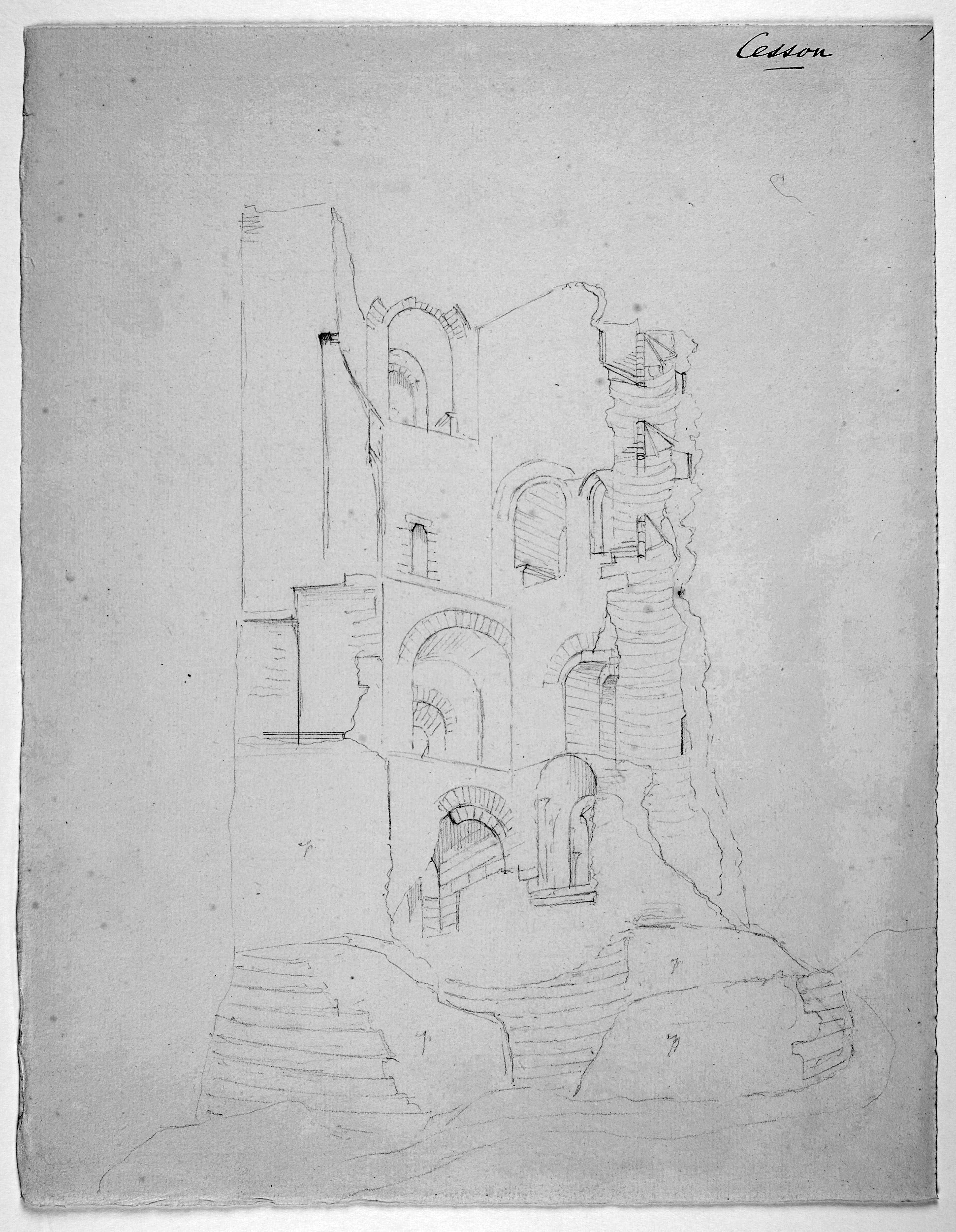 Dessin montrant les ruines de la Tour de Cesson (côté intérieur).