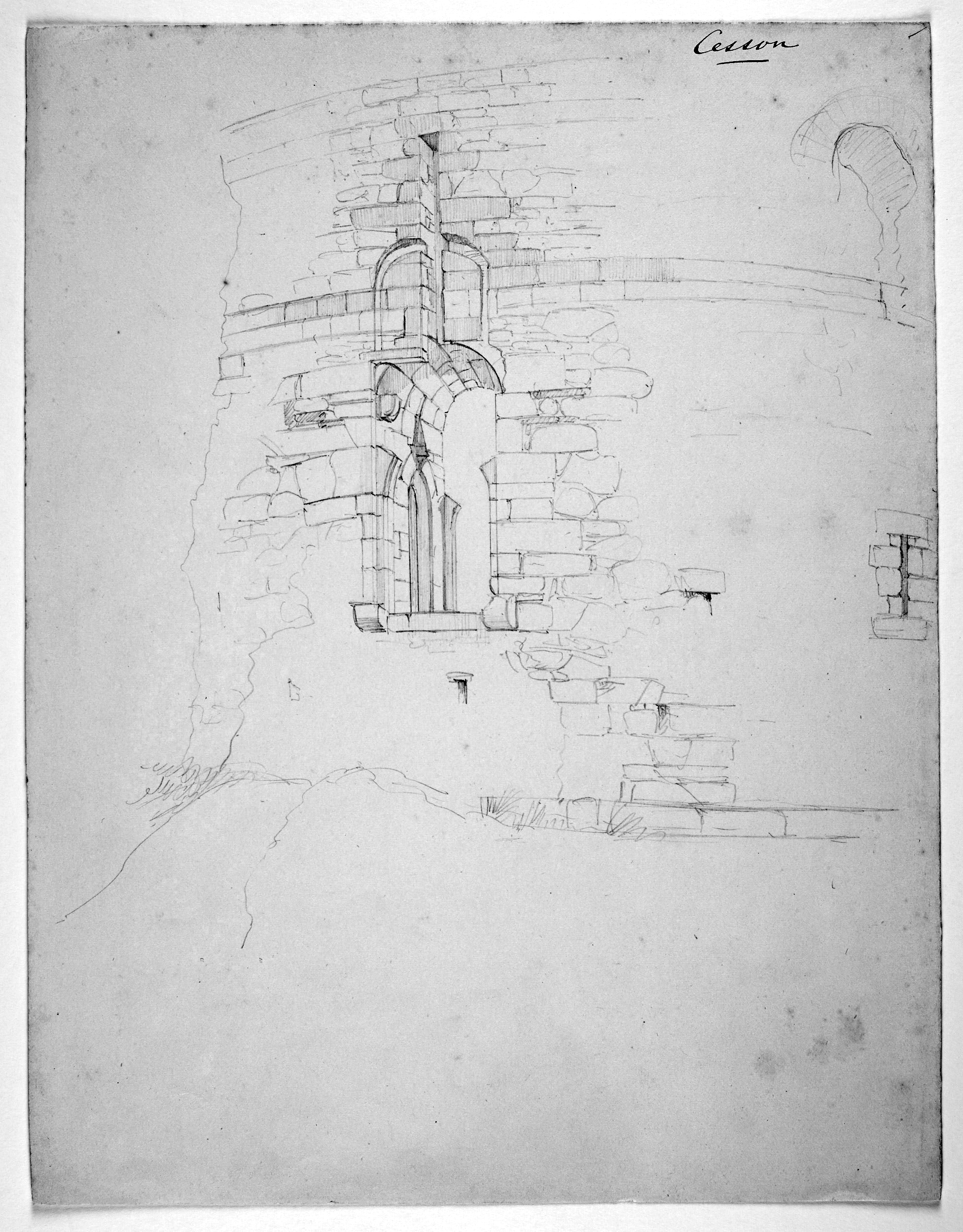Dessin montrant les ruines de la Tour de Cesson (côté extérieur à la base de la tour).