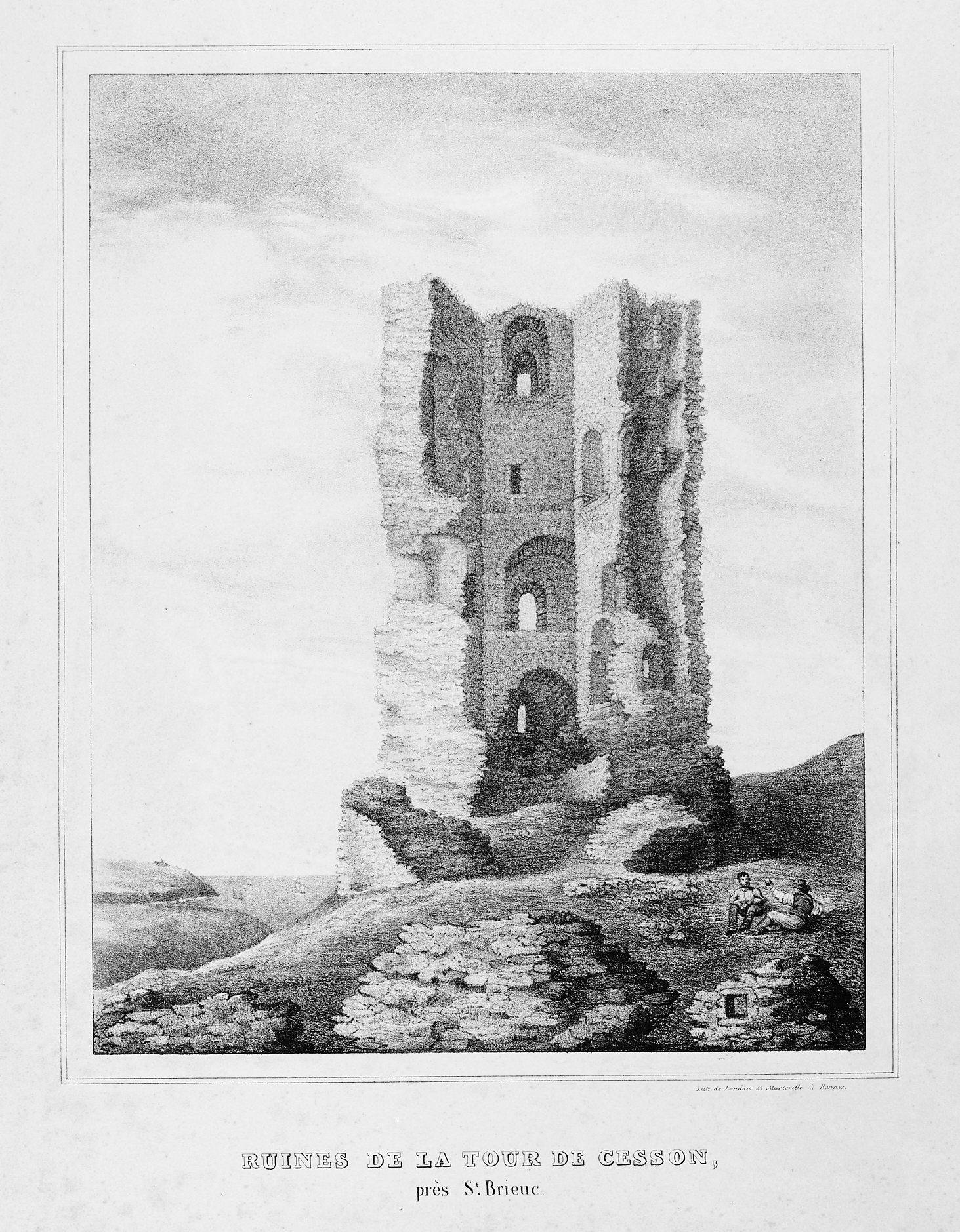 Vue générale de la Tour de Cesson, lithographie de Landais et Alphonse Marteville, Rennes, 1838. Pour facilter la lecture, l'image a été transformée en noir et blanc et le contraste a été augmentéImmatriculation