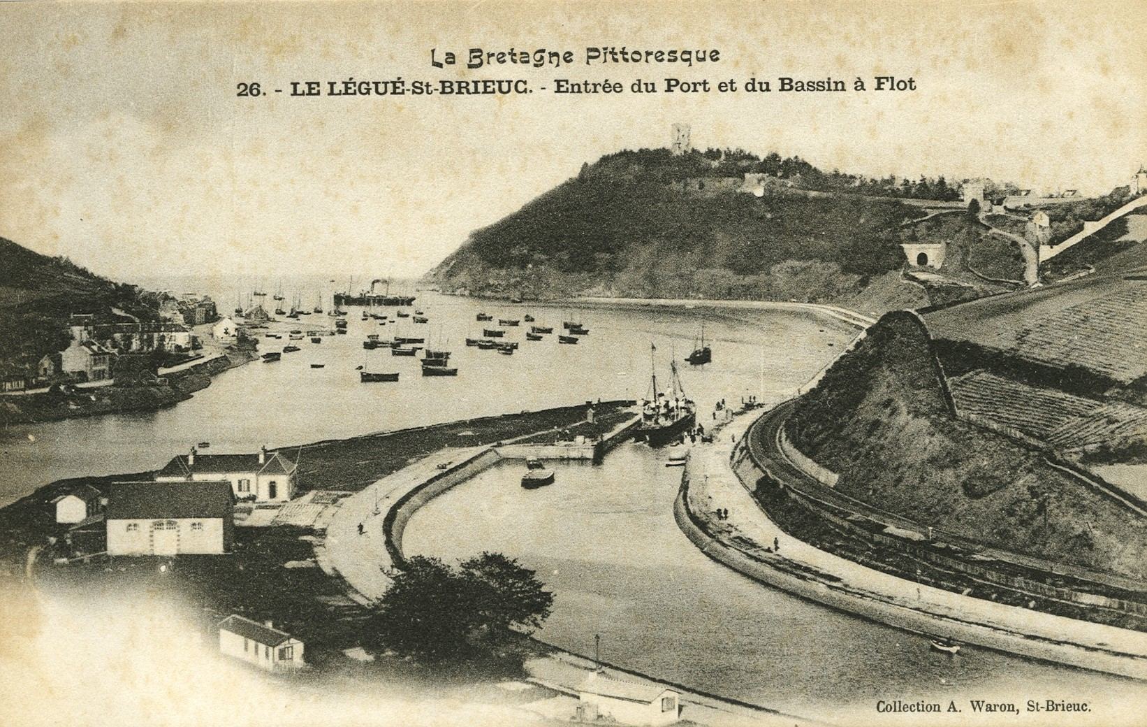 Vue de l'entrée du port du Légué et du bassin à flot (collection A. Waron, Saint-Brieuc). Dominant le Gouët, la Tour de Cesson. Trois élements crénelés se détachent : l'entrée du tunnel, la conciergerie (logement du concierge / gardien) et la Tour Malakoff, bélvédère sur le LéguéImmatriculation