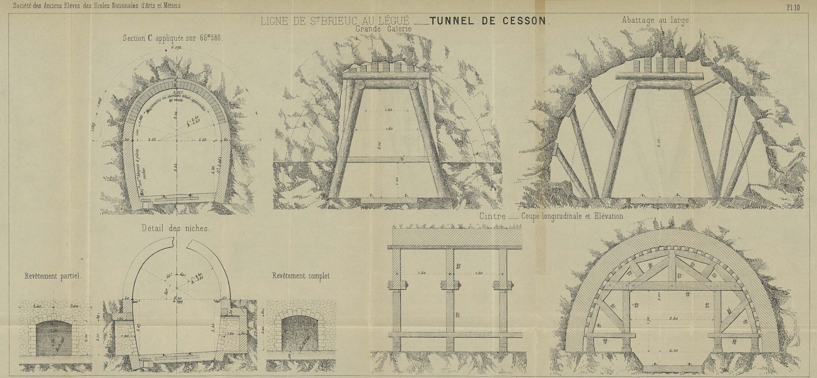MAZELLIER. "Chemins de fer et travaux publics. Tunnel de Cesson sur la Ligne de Saint-Brieuc au Légué". Paris : Librairie Chaix, Société des anciens élèves des Ecoles Nationales d'Arts et Métiers, Bulletin technologique, 1889.