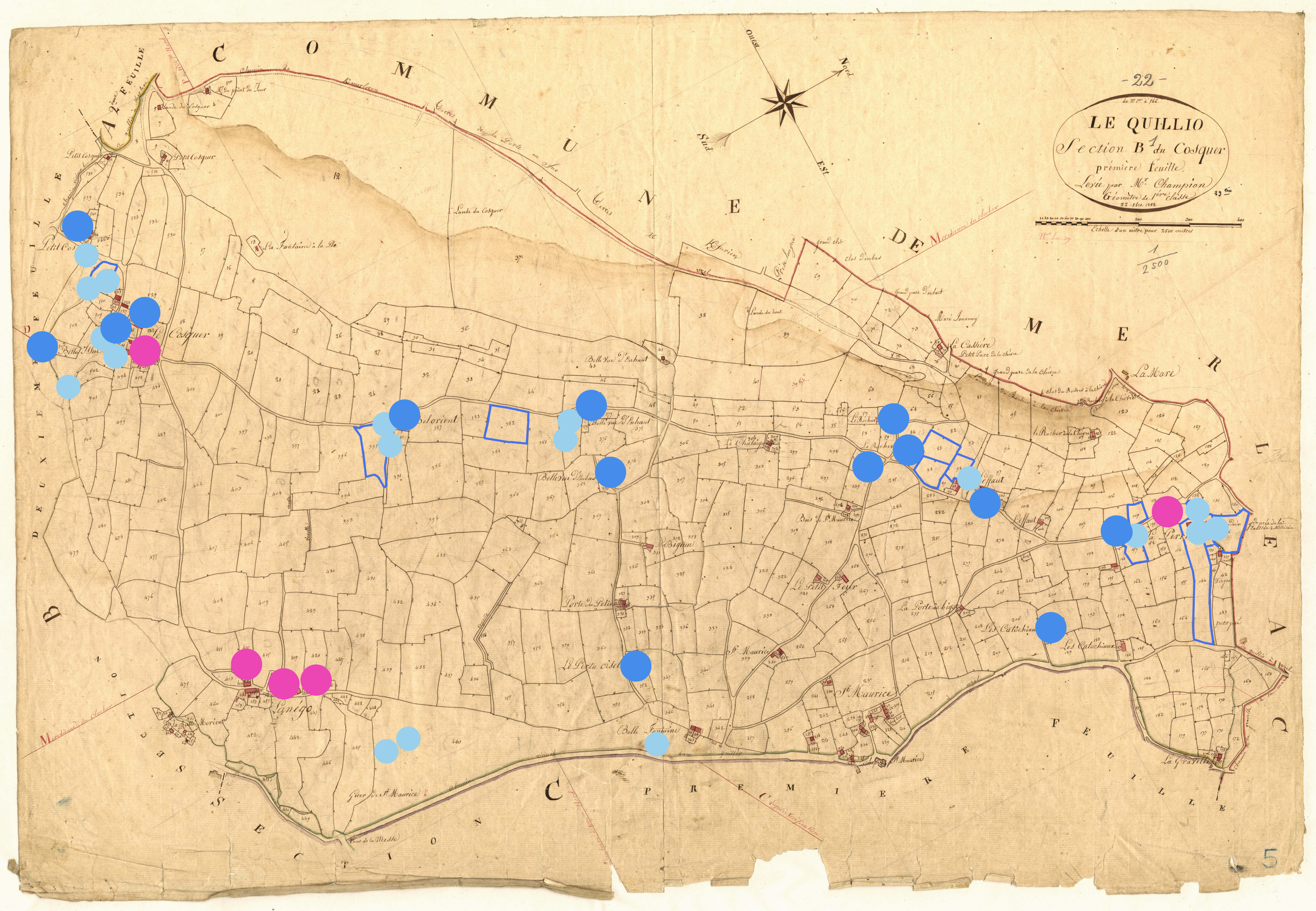 Patrimoine lié à l’histoire toilière du Quillio - Localisation des fermes ou maisons de marchand de toiles (points roses), des doués (points bleus clairs), et des maisons, fermes de blanchisseurs ou blanchisseries (points bleus foncés). Etendoirs entourés en bleu. D'après les états de section de 1829, section B1 (série 3 P 265, Archives départementales des Côtes-d'Armor)Immatriculation