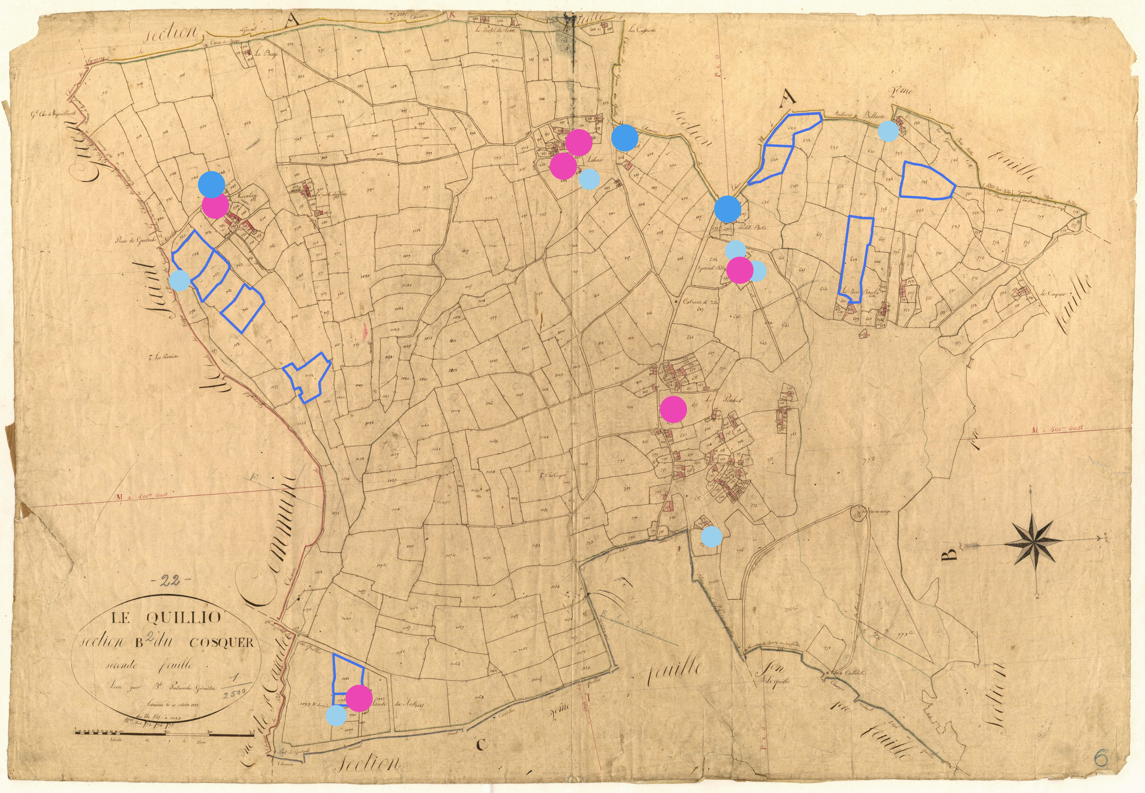 Patrimoine lié à l’histoire toilière du Quillio - Localisation des fermes ou maisons de marchand de toiles (points roses), des doués (points bleus clairs), et des maisons, fermes de blanchisseurs ou blanchisseries (points bleus foncés). Etendoirs entourés en bleu. D'après les états de section de 1829, section B2 (série 3 P 265, Archives départementales des Côtes-d'Armor)Immatriculation