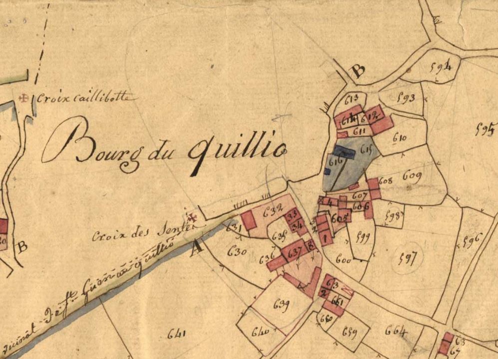 Partie est du bourg du Quillio en 1828. Extrait du cadastre ancien, section C2 (série 3 P 265, Archives départementales des Côtes-d'Armor)Immatriculation