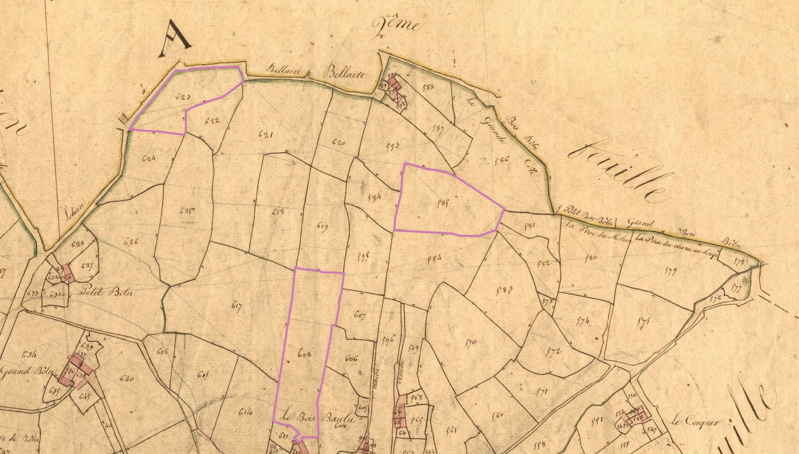 Bel Air en 1828. Extrait du cadastre ancien, section B2. Etendoirs entourés en rose (série 3P 265, Archives départementales des Côtes-d'Armor)Immatriculation
