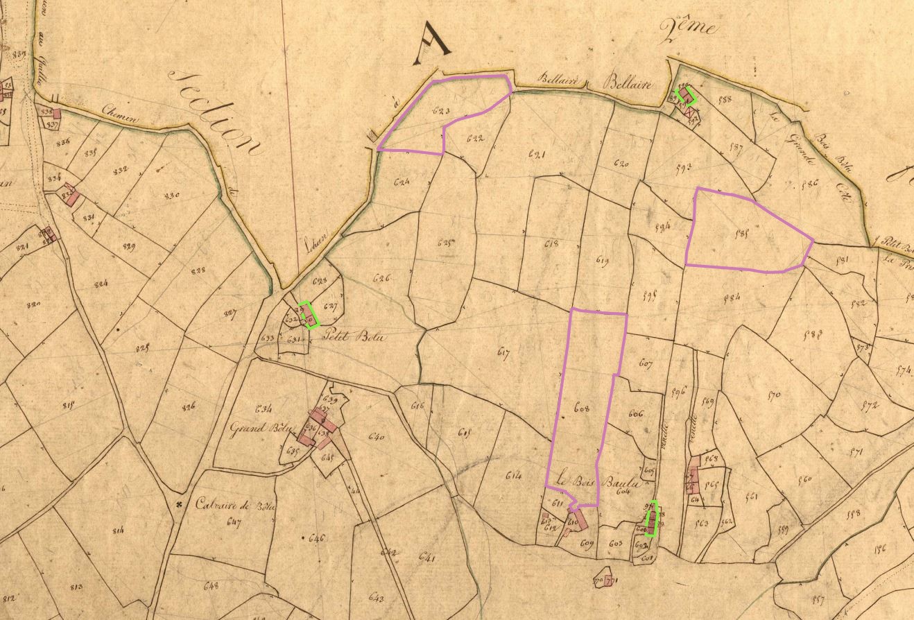Le Grand Bôlu, Le Petit Bôlu, Le Bois Bôlu et Bel Air en 1828. Extrait du cadastre ancien, section B2. Etendoirs en rose et maisons de blanchisseurs en vert (Archives départementales des Côtes-d'Armor, série 3 P 265)Immatriculation