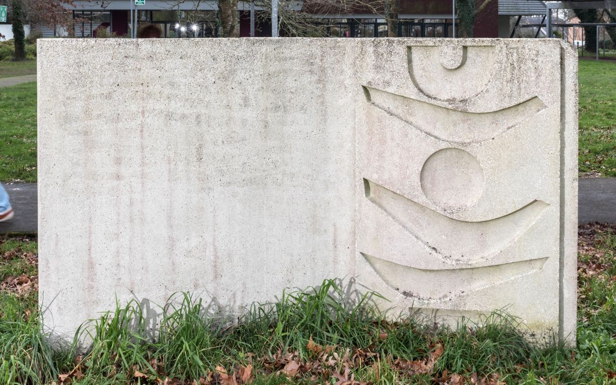 Un élément du mur sculpté, implanté le long de la galerie couverte, entre l'externat et les internats (Edgard Pillet), 1970.Immatriculation