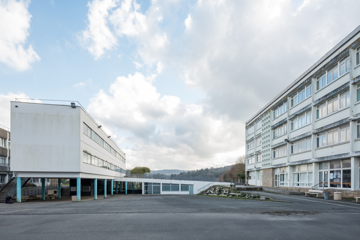 Vue d'ensemble de l'externat de 2001 (P. Ruelland et M. Quéré, architectes), prise du nord. A droite, façade est de l'internat filles et logements (Raymond Lopez, architecte, 1958).Immatriculation