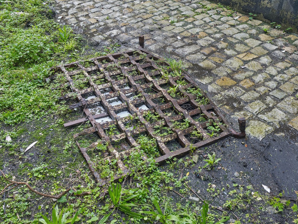 Vue d'une grille de fenêtre tombée dans la cour ouest. Ces grilles étaient scellée au plomb dans le granite. Avec la corrosion, le fer gonfle et fait éclater le granite et le scellement...Immatriculation