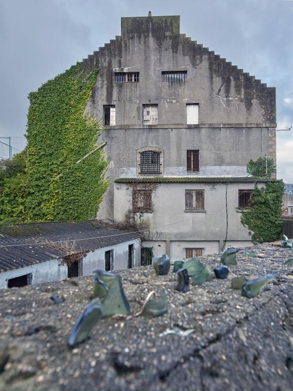 Vue du pignon sud du bâtiment carcéral depuis la rue de Pontaniou. Le pignon découvert est en gradin. Au premier plan, le mur de clôture dont le sommet est tapissé d'éclats de verre casséImmatriculation
