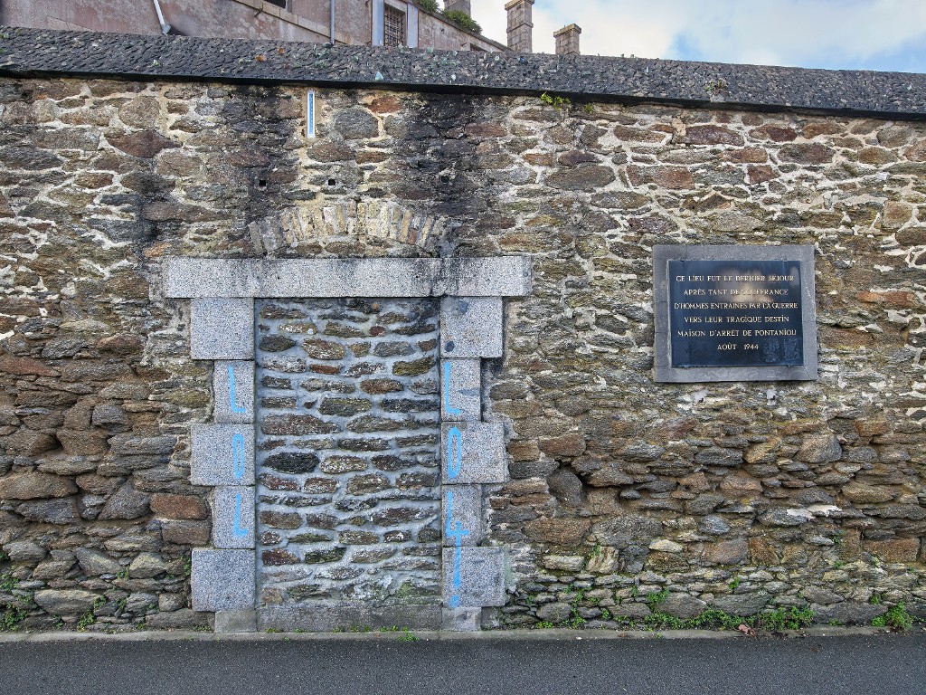 Vue de l'entrée piétonne côté rue de Pontaniou : elle est murée par des moellons. Sur le linteau en granite, on pouvait encore lire en 2005 : PRISON MARITIME. A droite, plaque commémorative des évènements tragiques d'août 1944Immatriculation