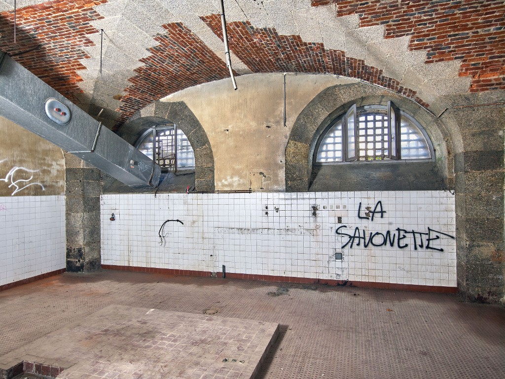 Vue de la pièce voûtée à deux travées du rez-de-chaussée, côté est : sa voûte complexe est en brique et en pierre de taille de granite gris. Elle servait de cuisine comme le montrent les murs et sols carrelés et le système d'aspirationImmatriculation