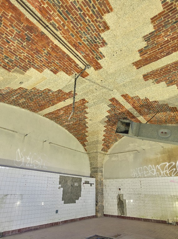 Vue de la pièce voûtée à deux travées du rez-de-chaussée, côté est : sa voûte complexe est en brique et en pierre de taille de granite gris. Elle servait de cuisine comme le montrent les murs et sols carrelés et le système d'aspirationImmatriculation
