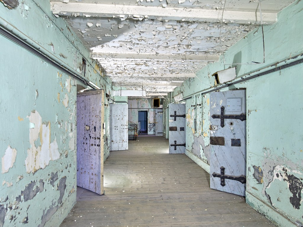 Vue du couloir central du troisième étage : de part et d'autre, des cellules. Les portes ont perdu serrure et verrou. La dalle du niveau de comble repose sur des poutres en béton ; le sol est en plancher boisImmatriculation
