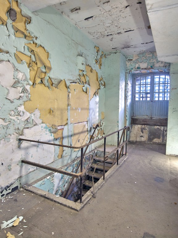Vue du couloir central du deuxième étage, extrémité sud : travée d'escalier avec ses deux rampes. Au-dessus d'une porte de cellule (murée, car transformé en logement), boîte à lumière en place. Le sol semble en cimentImmatriculation