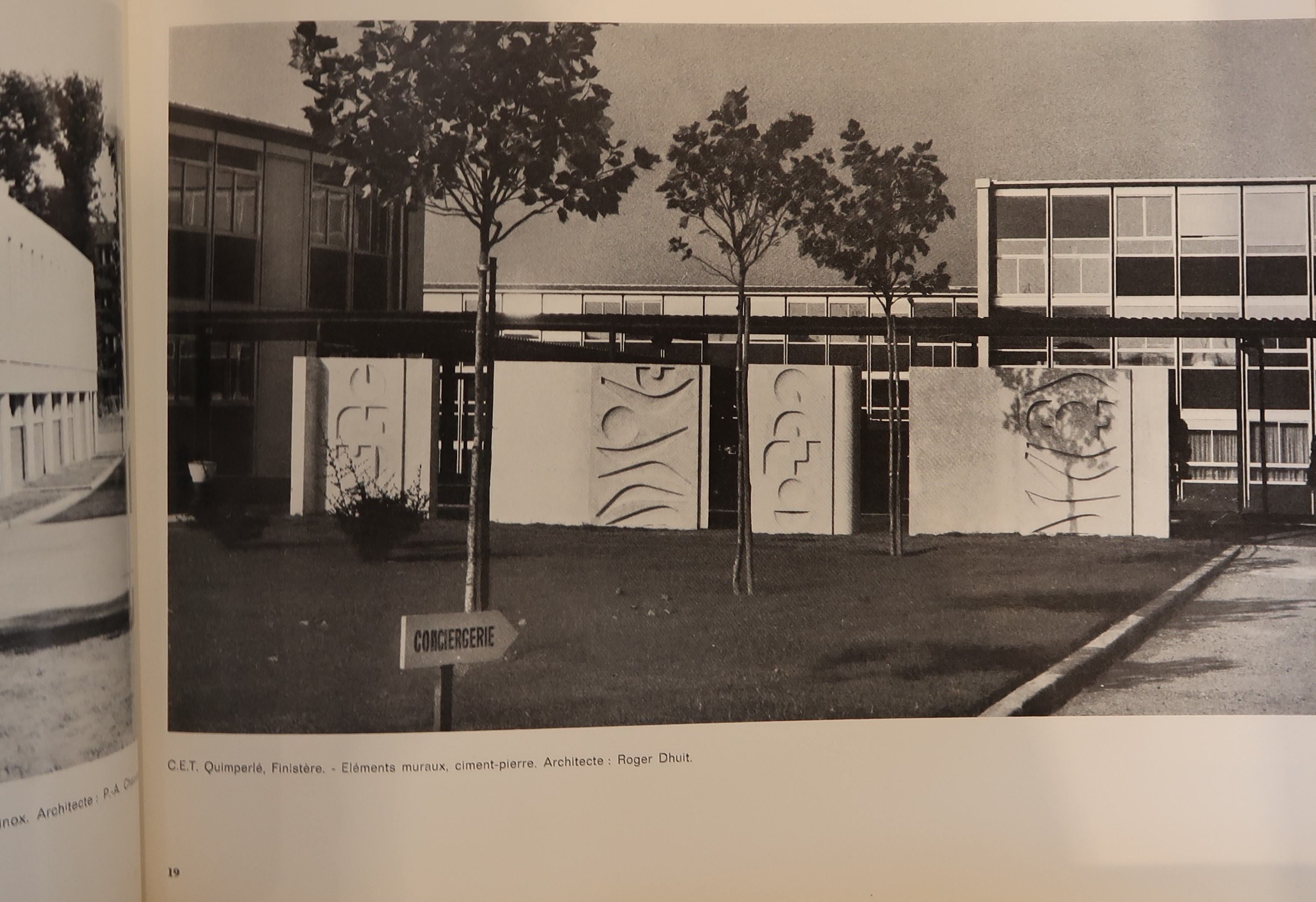 "C.E.T. Quimperlé, Finistère. - Eléments muraux, ciment-pierre. Architecte : Roger Dhuit". Vue du 1% du lycée Kerneuzec, publiée dans le livre :"Pillet. Sculptures dans l'Architecture" en 1974.Immatriculation