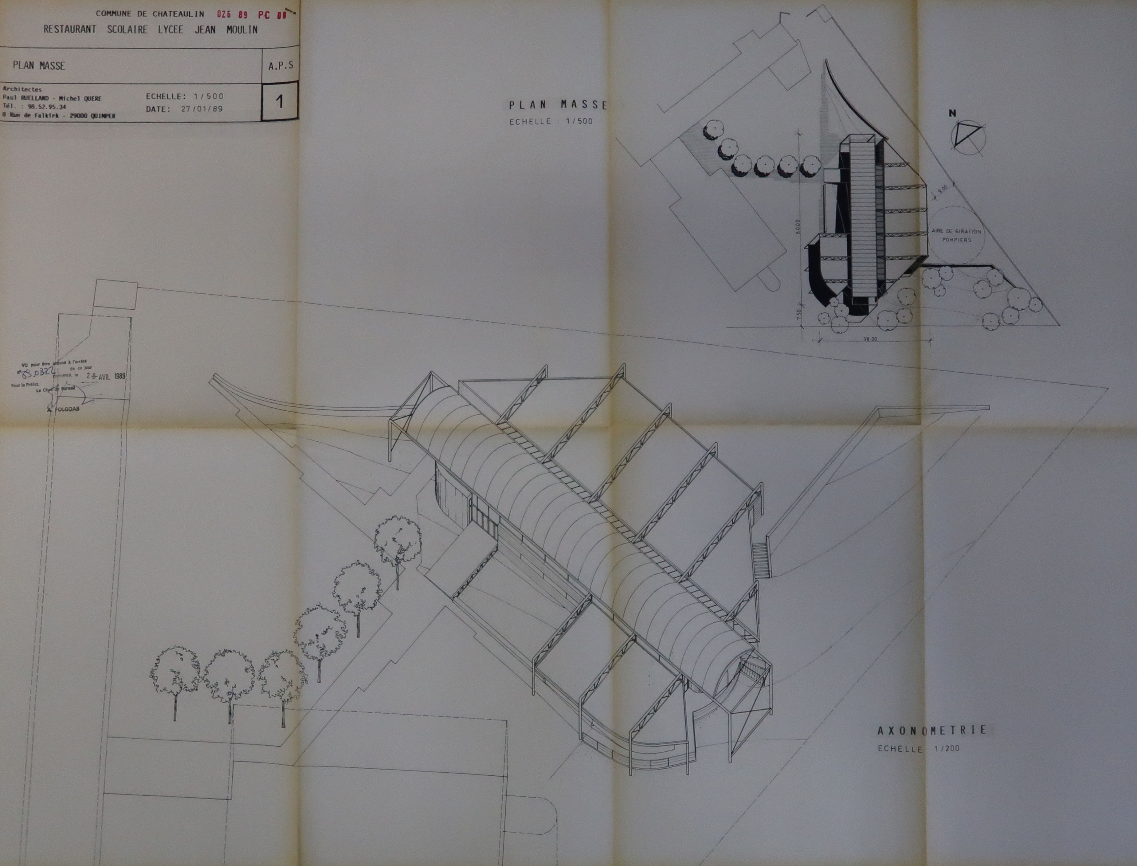 restaurant scolaire. Paln de masse et axonométrie. Paul Ruelland et Michel Quéré, architectes, 1989.Immatriculation