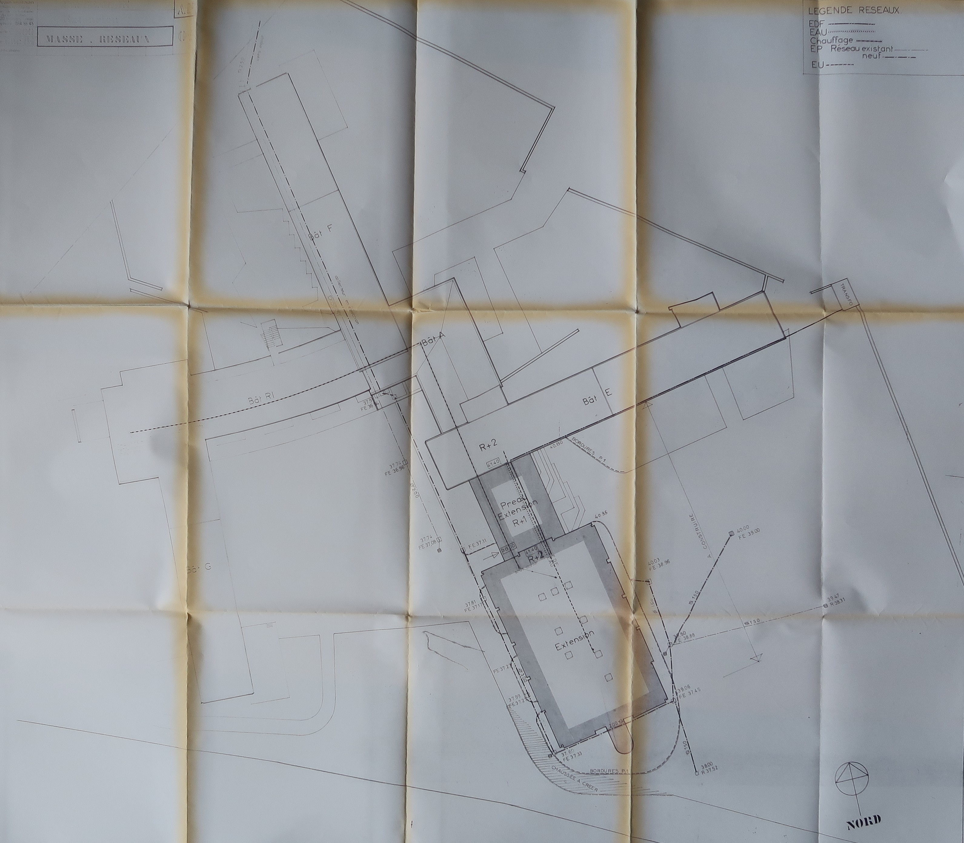 Extension du collège Jean Moulin. Plan de masse et réseaux. Sylvain Malizan, architecte, 1981.Immatriculation