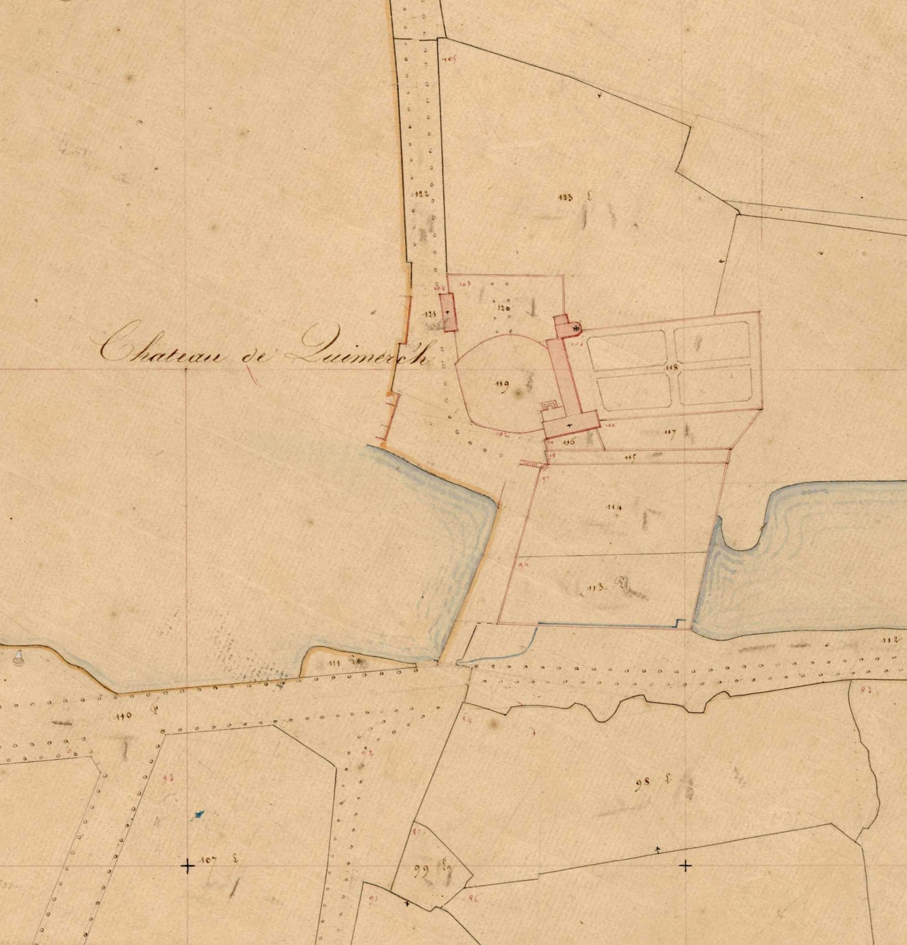 Extrait du cadastre parcellaire de la commune de Bannelec, 1844 (section G1 de Kerneuzec, feuille 1) : château de Quimerc'h, chapelle, cour, murs de clôture, jardin, parc et dépendancesImmatriculation