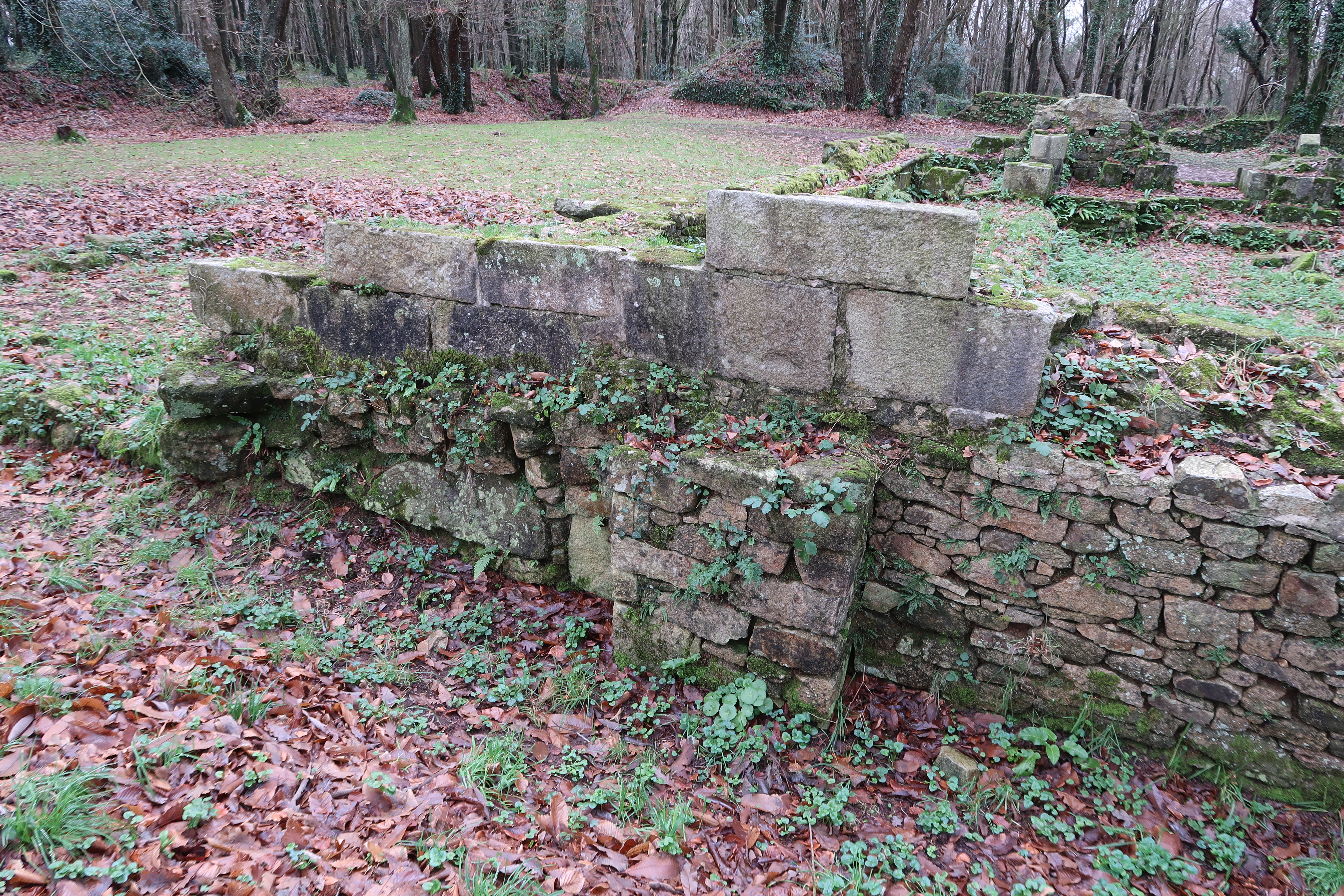 Vue du mur est (chevet plat). On distingue trois types différents d'appareillage (moellon et pierre de taille de granite). Cette portion de mur correspond à la création du bas-côté au sudImmatriculation