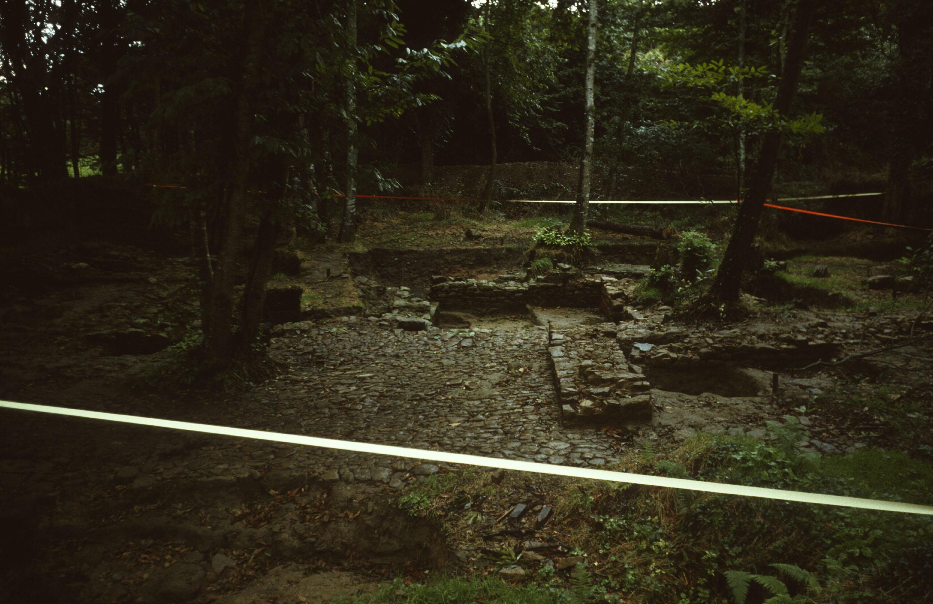 Vue de l'intérieur de la basse-cour : vestiges de bâtiments et cour dallée, état en 1981Immatriculation