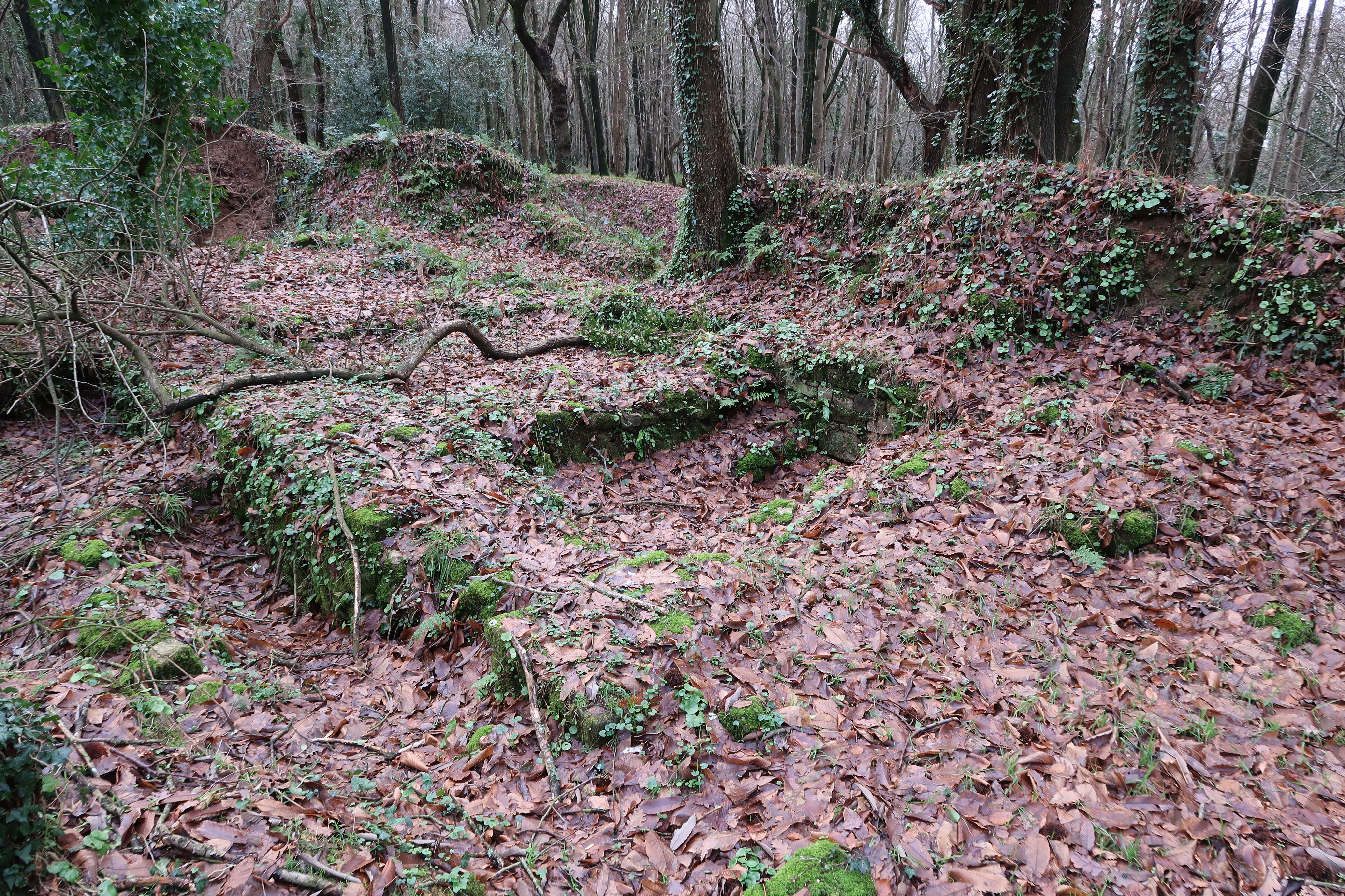 Vue de l'intérieur de la basse-cour : vestiges de bâtiments, état dans l'hiver 2023Immatriculation