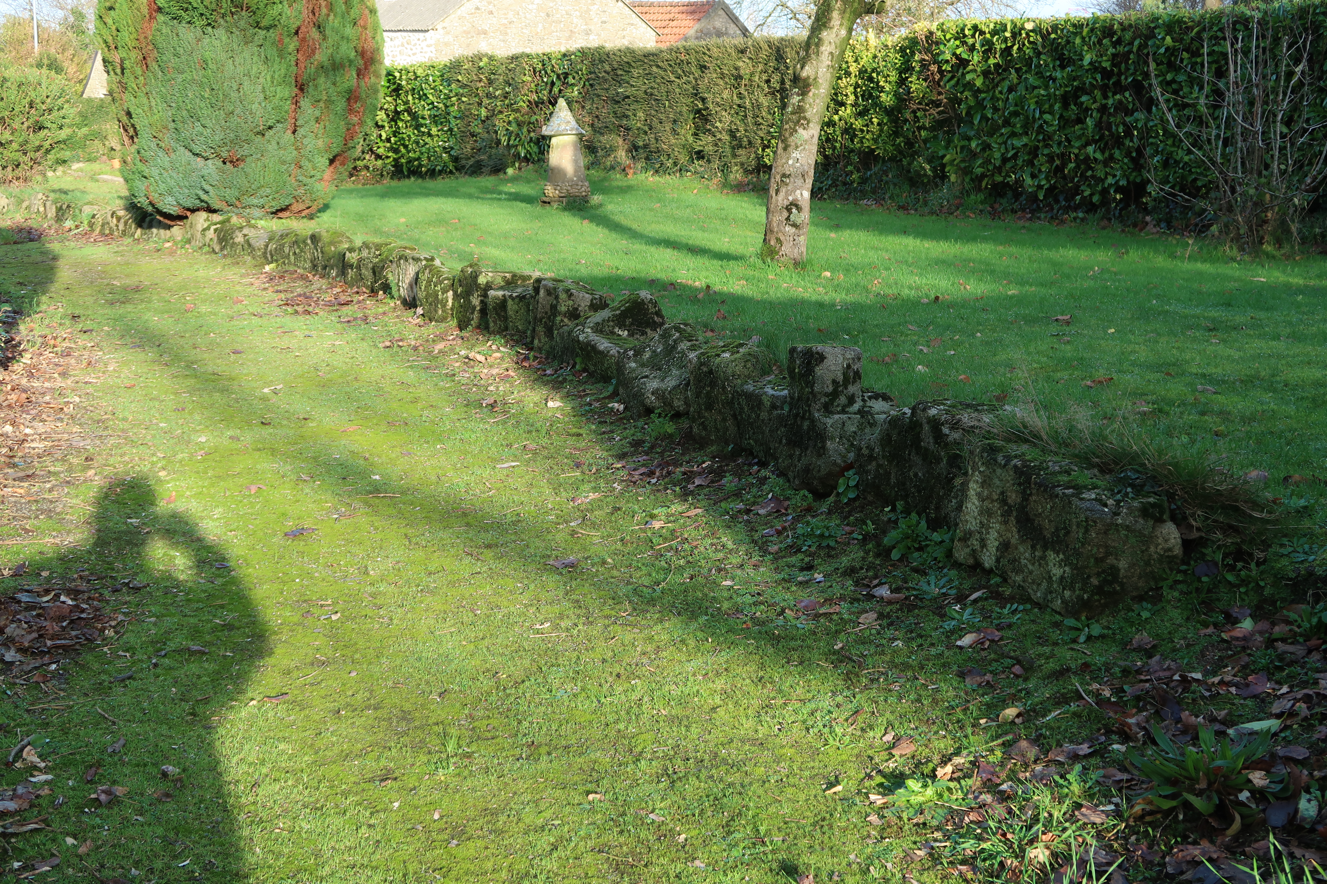 Vue du jardin de la ferme de La Salle (I), état en hiver 2023. Des pierres de taille provenant de constructions anciennes sont réemployées comme bordureImmatriculation