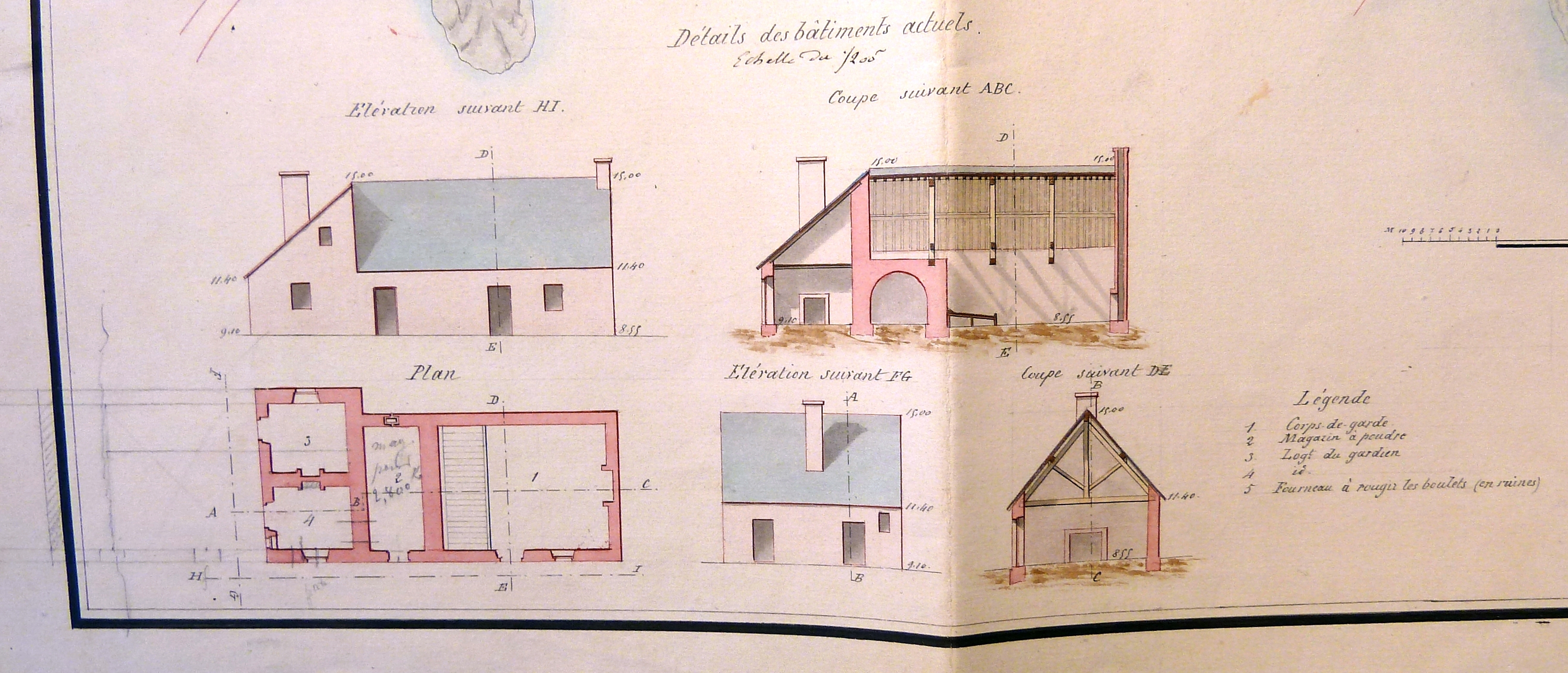 Projets pour 1862-1863, 26 février 1862 : détail de la planche, plan, coupes et élévations des bâtiments actuels (collection : Service historique de la Défense)Immatriculation