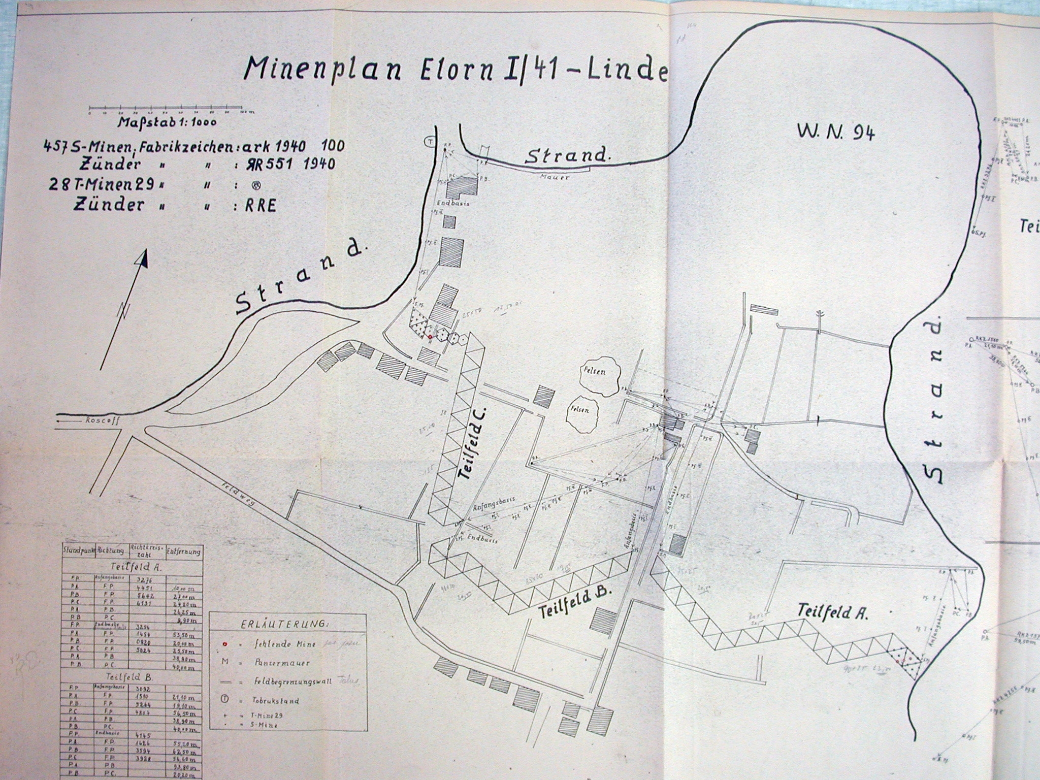 Plan de détail du champ de mines Elorn I/41 "Linde" (tilleul) divisé en trois sections A, B et C posé le 20 février 1943 au-delà d'An Diou Roc'h