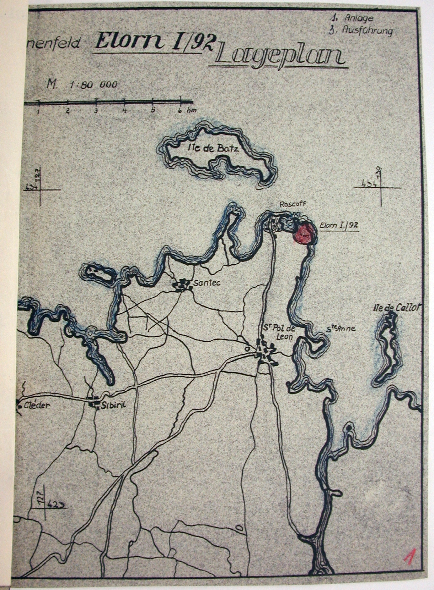 Plan de situation du champs de mines Elorn I/92 divisée en deux sections A et B posé le 20 juillet 1943 (3./Pi./Btl. 371 : 42294D)
