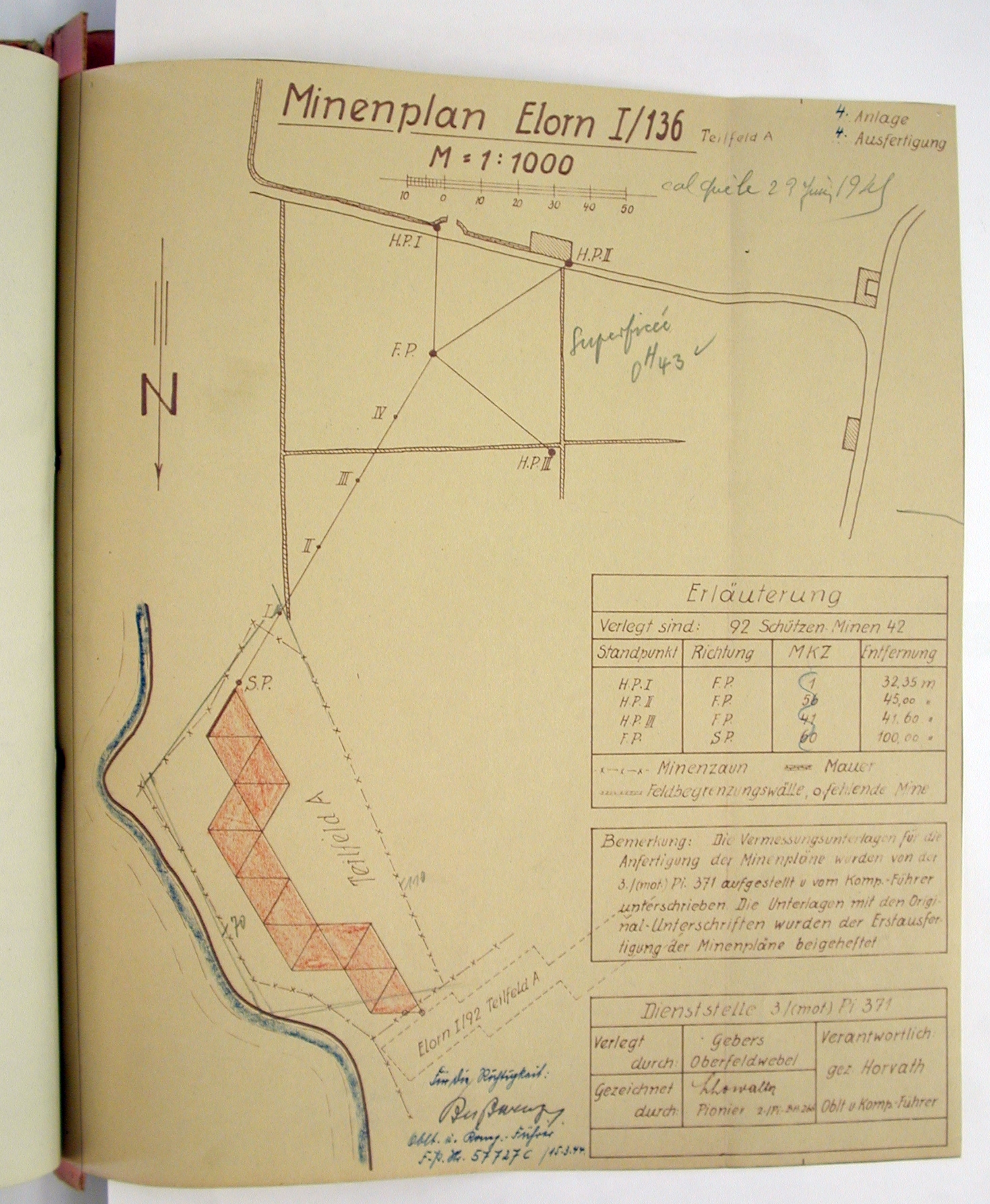 Plan de détail du champ de mines Elorn I/136 posé le 28 septembre juillet 1943 (3./Pi./Btl. 371 : 42294D)-
