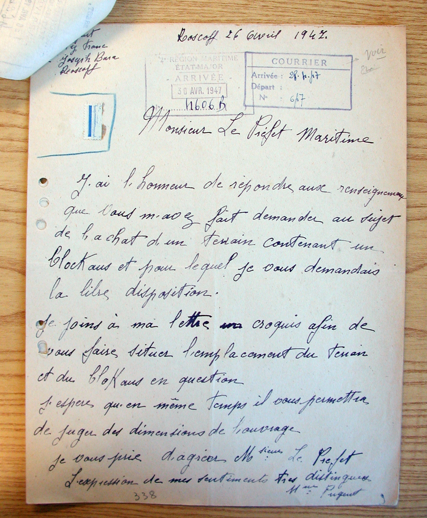 Courrier adressé au préfet maritime Branellec par madame Prigent de Roscoff au sujet de la libre disposition d'un blockhaus, 4 avril 1947 (collection : Service Historique de la Défense à Brest)Immatriculation