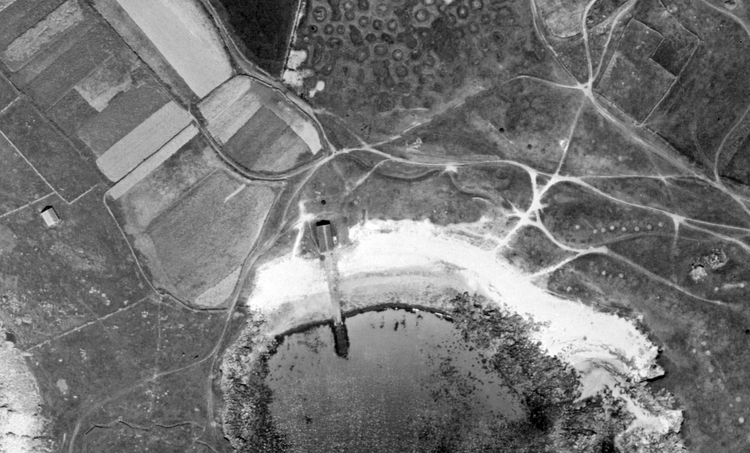 Vue aérienne verticale de Porz Reter, 1951. On distingue l'abri du canot de sauvetage et sa rampe inclinée aménagée sur la grève. A l'extrême gauche, le corps de garde OuestImmatriculation