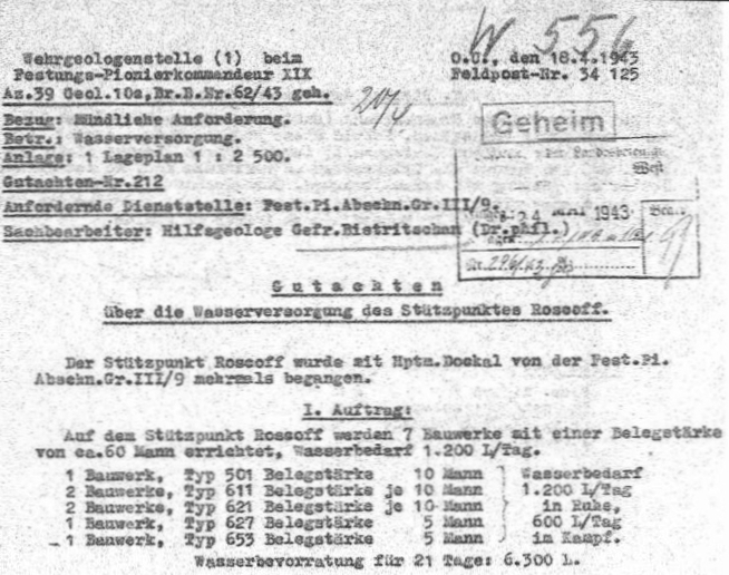 Document à propos de l’approvisionnement en eau (Wasserversorgung) du Stützpunkt Roscoff, 18 avril 1943Immatriculation
