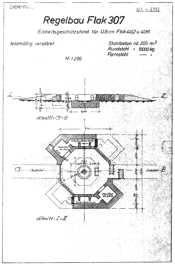 Plan et coupe d'un bunker - cuve de type Fl 307 (Einheitsgeschützstand für 12,8cm Flak 40)Immatriculation